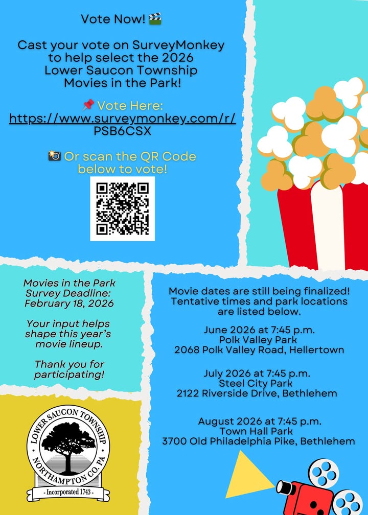 Today is your last day to vote (2/18/26)! It's time to cast your vote for the 2026 Lower Saucon Township Movies in the Park series! Your input helps us select the films that will be shown in our beautiful township parks this summer. How to Vote: Scan the QR Code