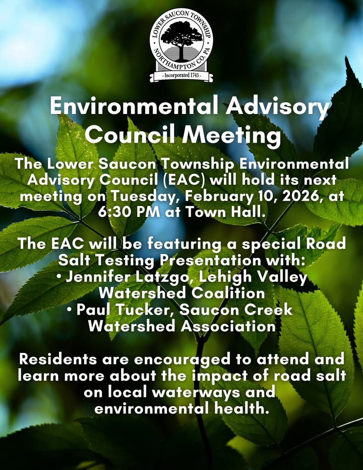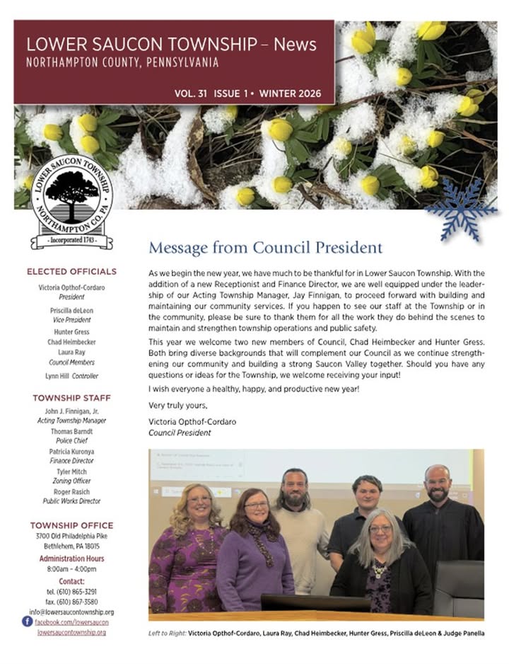 Our Winter 2026 Newsletter is now published on the Lower Saucon Township website! Important Reminder: We are no longer mailing newsletters to residents. You can access it online by following these steps: Visit: www.lowersaucontownship.org/index.php Navigate to Residents and click on Newsletters. Click on the Current Newsletter - Winter 2026 to