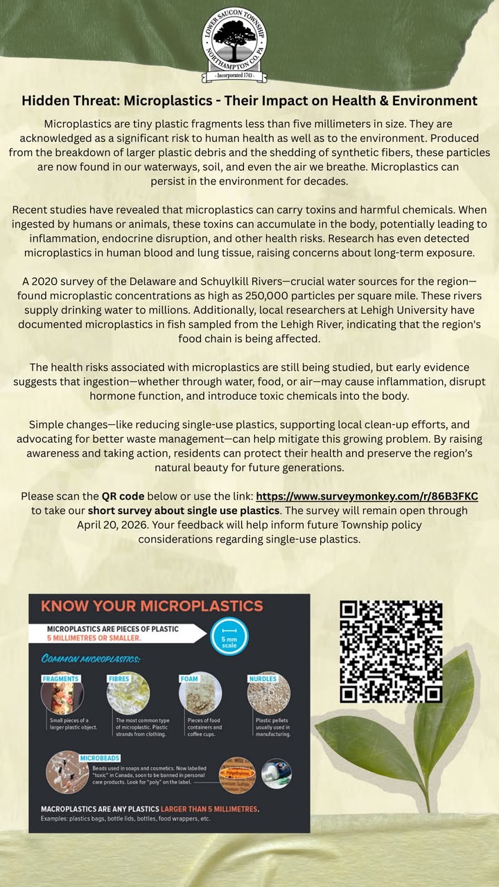 Lower Saucon Township EAC Microplastics Survey Microplastics—tiny plastic particles smaller than a grain of rice—are increasingly found in our water, soil, air, and even the human body. Studies show they can carry harmful chemicals and may contribute to inflammation and other health concerns. Locally, high levels have been detected in