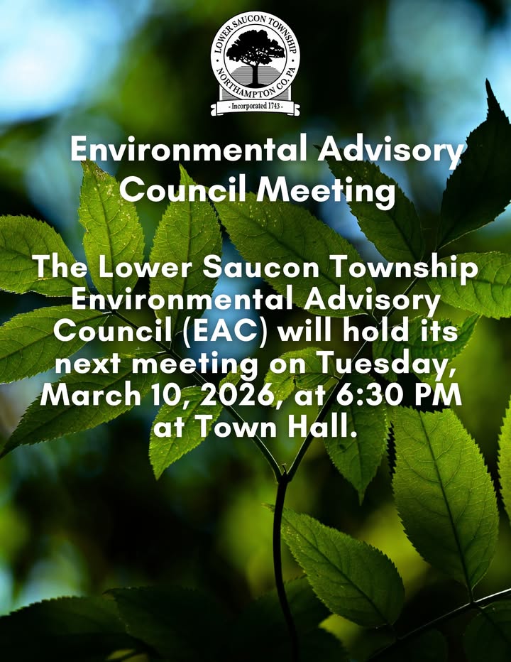 The EAC meeting is scheduled for Tuesday, March 10, 2026 starting at 6:30 p.m. at Town Hall and will be broadcast live on YouTube. The links to view the meeting and agenda, may be found below and on our website. Lower Saucon Township YouTube Channel: www.youtube.com/@LowerSauconTownship EAC agenda: cms2.revize.com/revize/lowersaucontwp/Images/Environmental%20Advisory%20Council/2026-03-10%20March%20EAC%20meeting.pdf